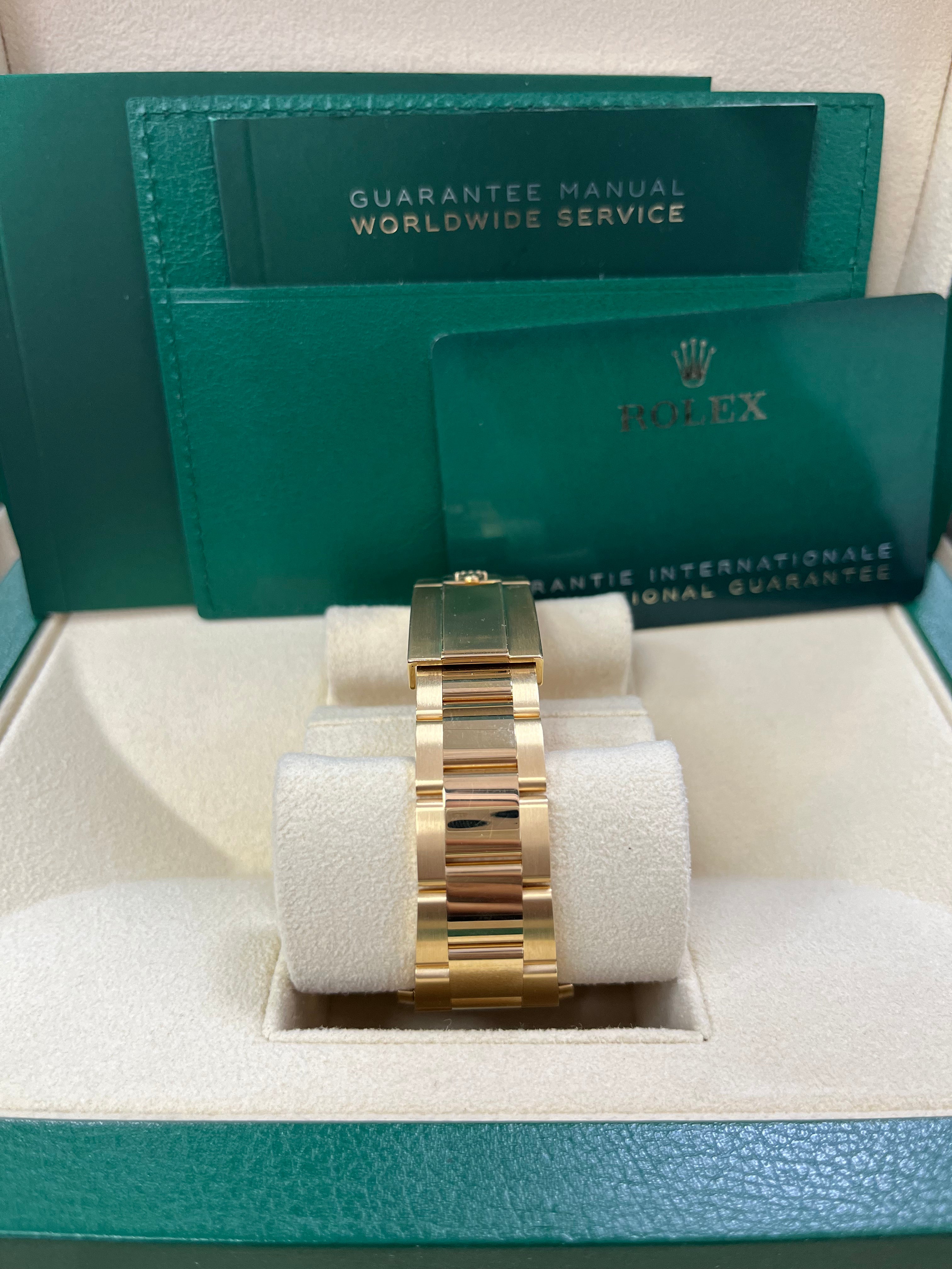 40mm 18K yellow gold case, screw-down back, screw-down crown and push buttons with Triplock triple waterproofness, fixed 18K yellow gold bezel with engraved tachymetric scale, scratch-resistant sapphire crystal, black dial, diamond hour markers, Rolex calibre 4130 self-winding movement with chronograph central second hand, 30-minute counter at 3 o'clock, and 12-hour counter at 9 o'clock, approximately 72 hours of power reserve, 18K yellow gold Oyster bracelet with flat three-piece links, folding Oysterlock buckle with Easylink 5mm comfort extension link. Waterproof to 100 meters.