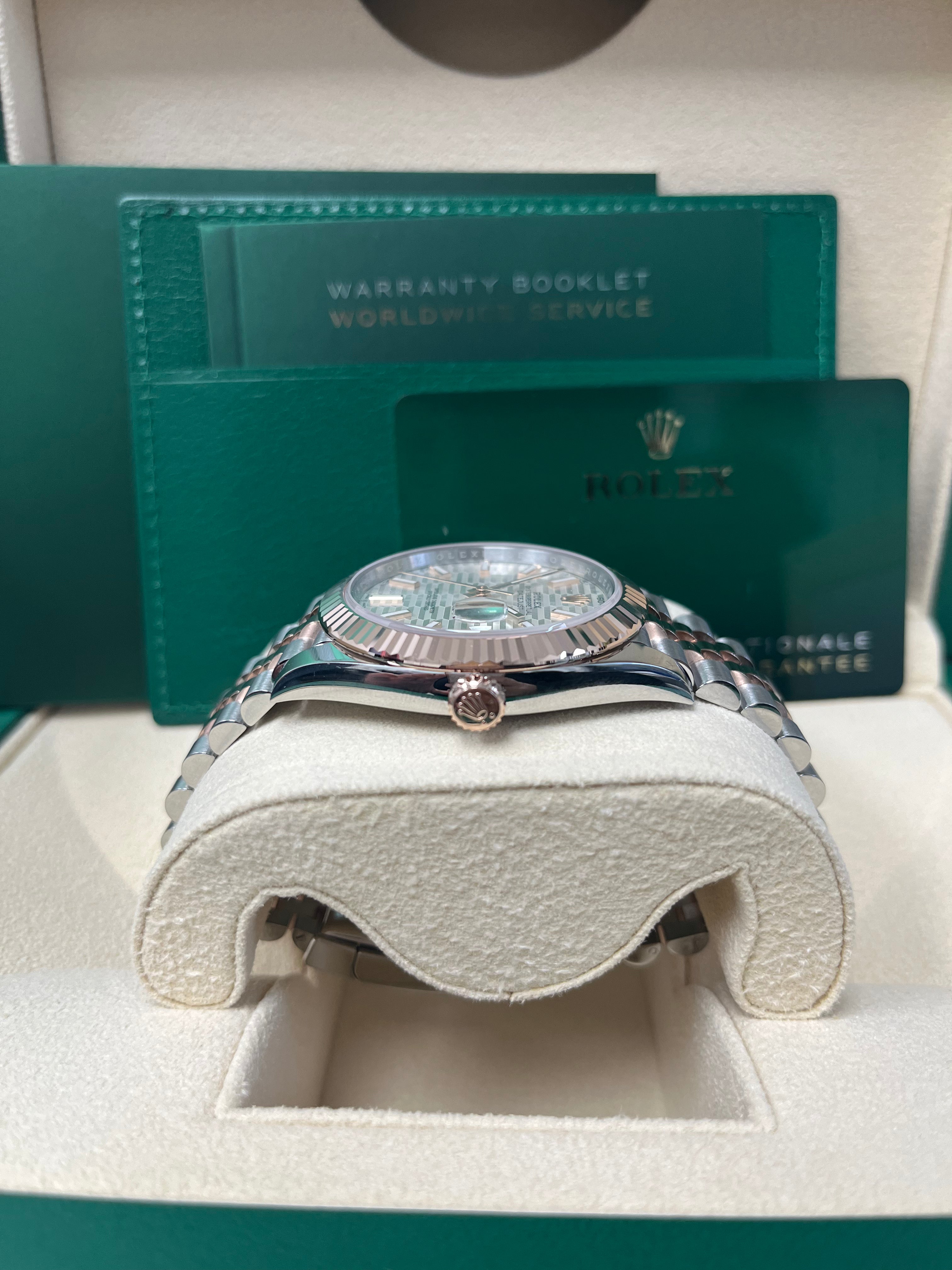 41mm Everose Rolesor case comprised of Oystersteel and Everose gold, screw-down back, screw-down crown with twinlock double waterproofness system, fluted bezel, scratch-resistant sapphire crystal with cyclops lens over the date, silver fluted motif dial, index hour markers, Rolex calibre 3235 perpetual self-winding movement with centre hour, minute and seconds hands, instantaneous date with rapid setting, and stop-seconds for precise time setting, approximately 70 hours of power reserve, Jubilee bracelet with five-piece links, folding Oysterclasp buckle with Easylink 5mm comfort extension link. Waterproof to 100 metres / 330 feet.