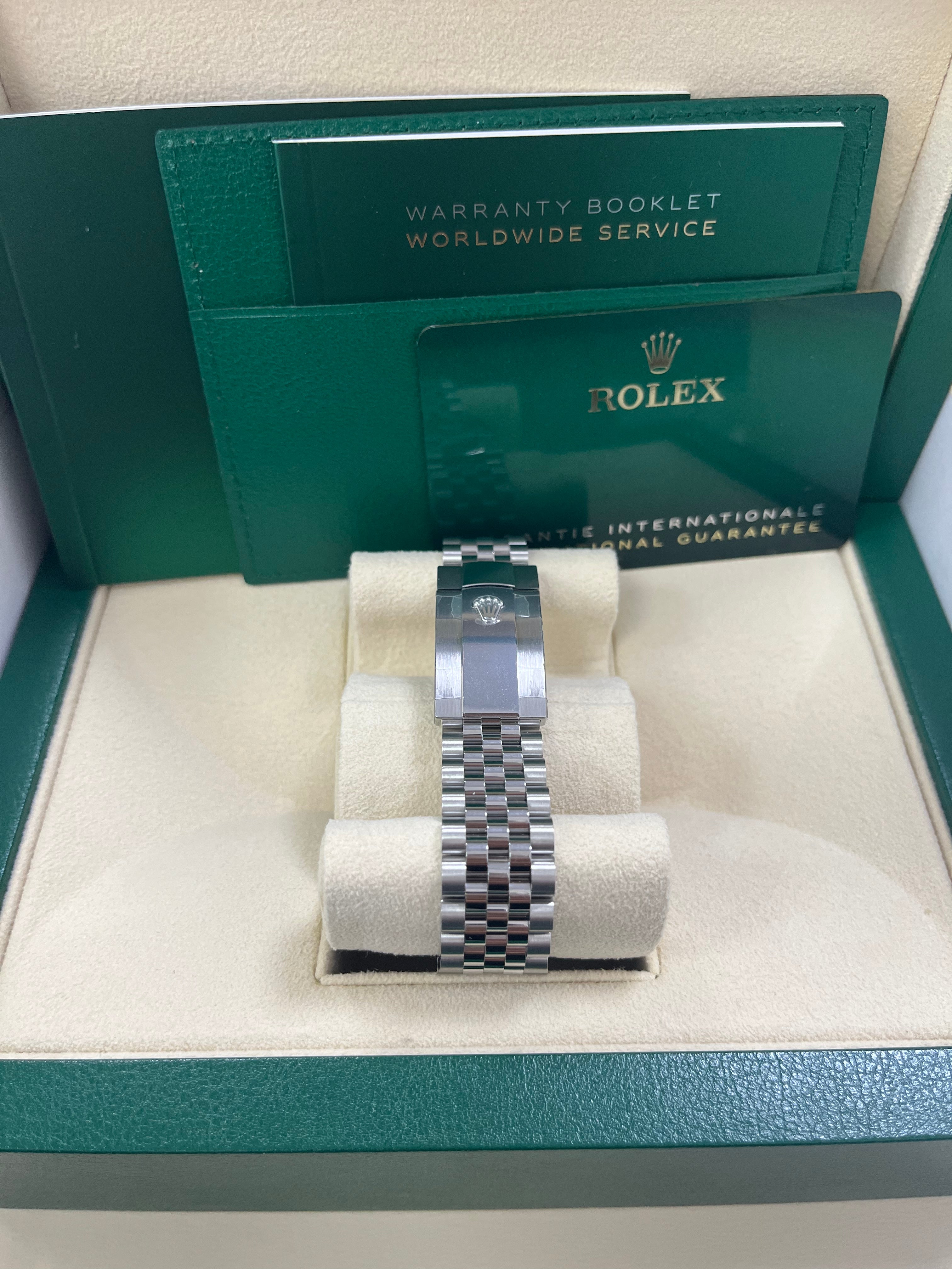 41mm 904L stainless steel case, screw-down steel back, screw-down crown with twin lock double waterproofness system, smooth bezel, scratch-resistant double anti-reflective sapphire crystal with cyclops lens over the date, blue dial, index hour markers. Rolex calibre 3235 perpetual self-winding movement with date at 3 o'clock that changes instantaneously at midnight in a few thousandths of a second, approximately 70 hours of power reserve, 904L steel Jubilee bracelet with five-piece links, folding Oysterclasp buckle with Easylink 5mm comfort extension link. Waterproof up to 100 meters.