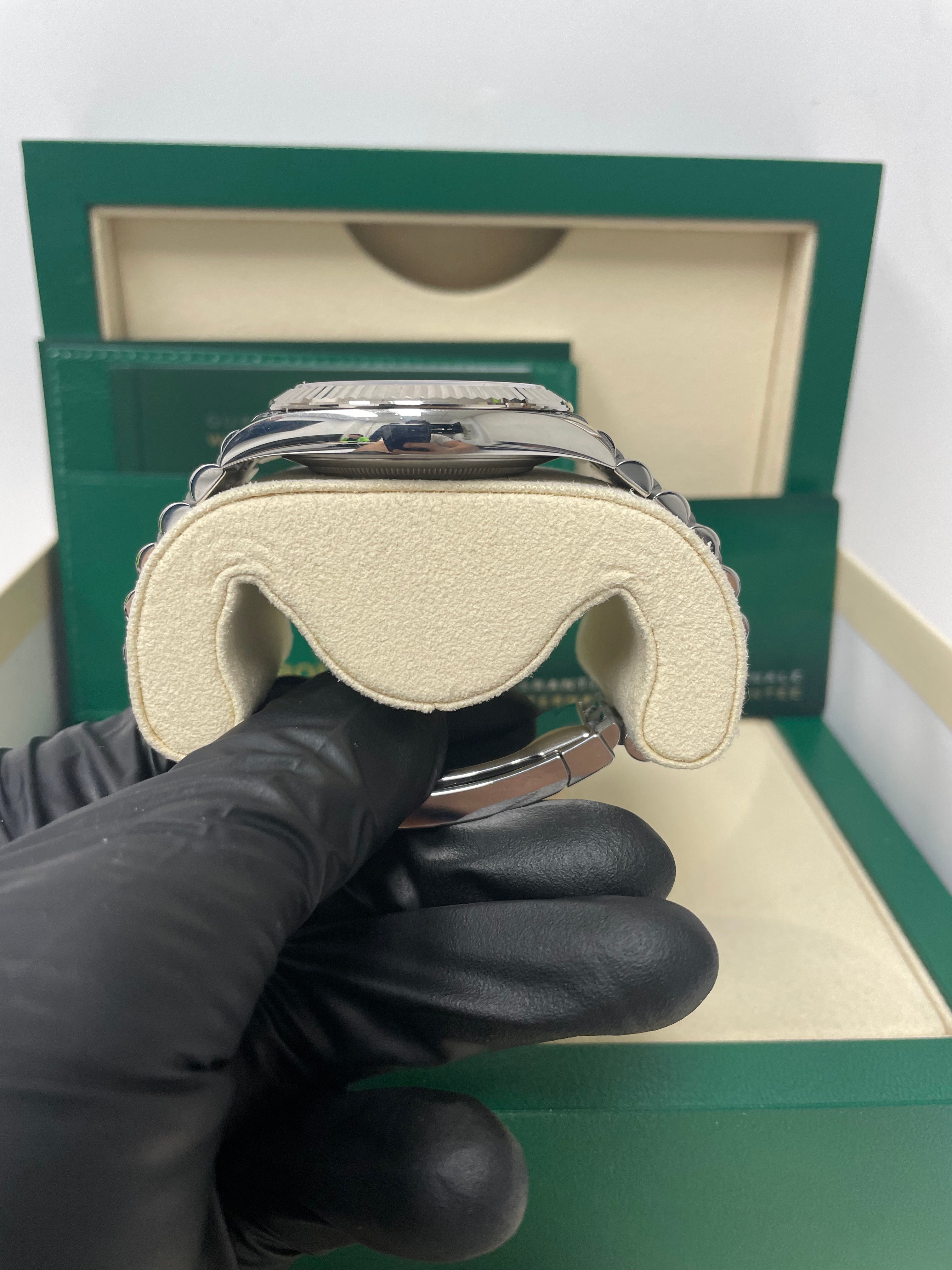 41mm white Rolesor case comprised of a 904L steel monobloc middle case, screw-down steel back, screw-down crown with twin lock double waterproofness system, 18K white gold fluted bezel, scratch-resistant double anti-reflective sapphire crystal with cyclops lens over the date, white dial, index hour markers. Rolex calibre 3235 perpetual self-winding movement with date at 3 o'clock that changes instantaneously at midnight in a few thousandths of a second, approximately 70 hours of power reserve, 904L steel Jubilee bracelet with five-piece links, folding Oysterclasp buckle with Easylink 5mm comfort extension link. Waterproof up to 100 meters.