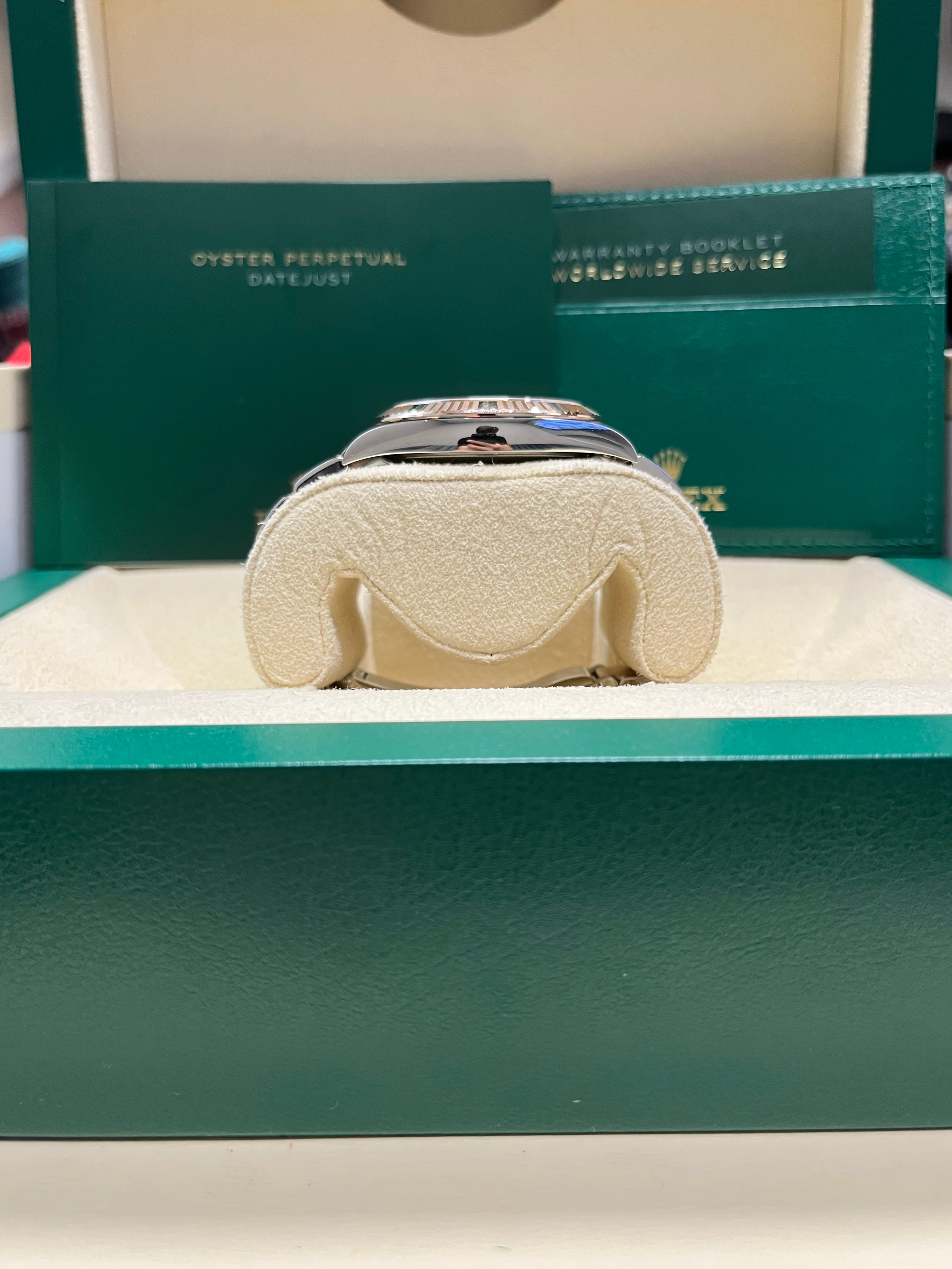 41mm Everose Rolesor case with 904L steel monobloc middle case, screw-down steel back, 18K Everose gold screw-down crown, 18K Everose gold fluted bezel, scratch-resistant double anti-reflective sapphire crystal with cyclops lens over the date, Sundust dial, diamond hour markers, Rolex calibre 3235 perpetual self-winding movement with date at 3 o'clock that changes instantaneously at midnight in a few thousandths of a second, approximately 70 hours of power reserve, Everose Rolesor Jubilee bracelet made from a combination of 904L steel and 18K Everose gold with five-piece links, folding Oyster-Clasp buckle with Easylink 5mm comfort extension link. Water-resistant up to 100 meters.