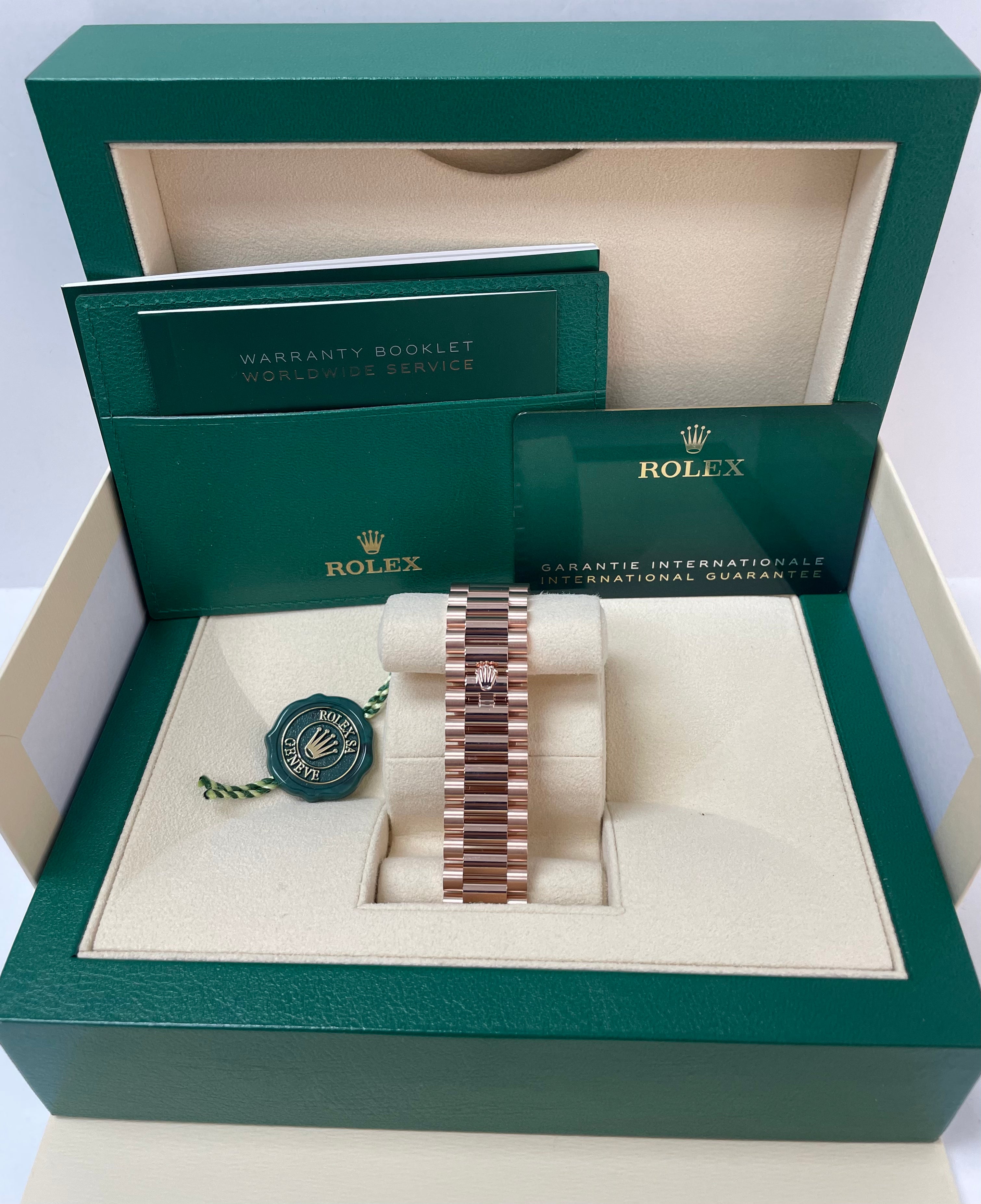 40mm 18K Everose gold case, screw-down back with Rolex fluting, screw-down crown with twinlock double waterproofness system, Everose gold bezel set with 48 diamonds, scratch-resistant double anti-reflective sapphire crystal with cyclops lens over the date, chocolate dial, 10 baguette diamond hour markers, Rolex calibre 3255 automatic movement with centre hour, minute and seconds hands, instantaneous day and date in apertures, unrestricted rapid-setting, and stop-seconds for precise time setting, approximately 70 hours of power reserve, President bracelet with three-piece solid links comprised of a polished center link, satin-finished outer links, and ceramic inserts, concealed folding Crownclasp buckle. Waterproof to 100 meters.