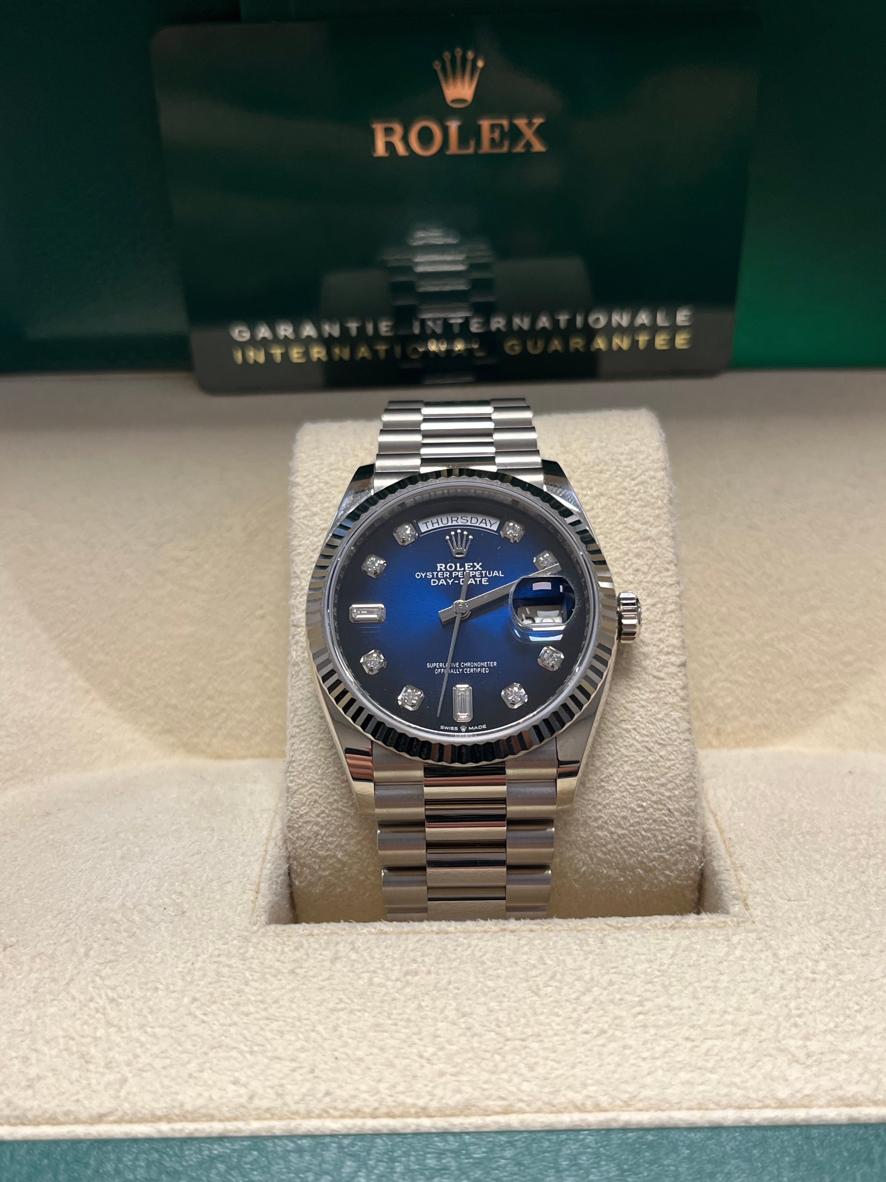 Rolex Day-Date 36/ Blue Ombre Dial/ Diamond Bezel/ White Gold President Bracelet (Ref # 128349RBR)