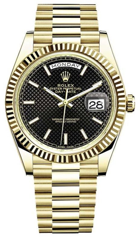 Rolex Day-Date 40 Yellow Gold Black Motif Index Dial Fluted Bezel (Ref# 228238)