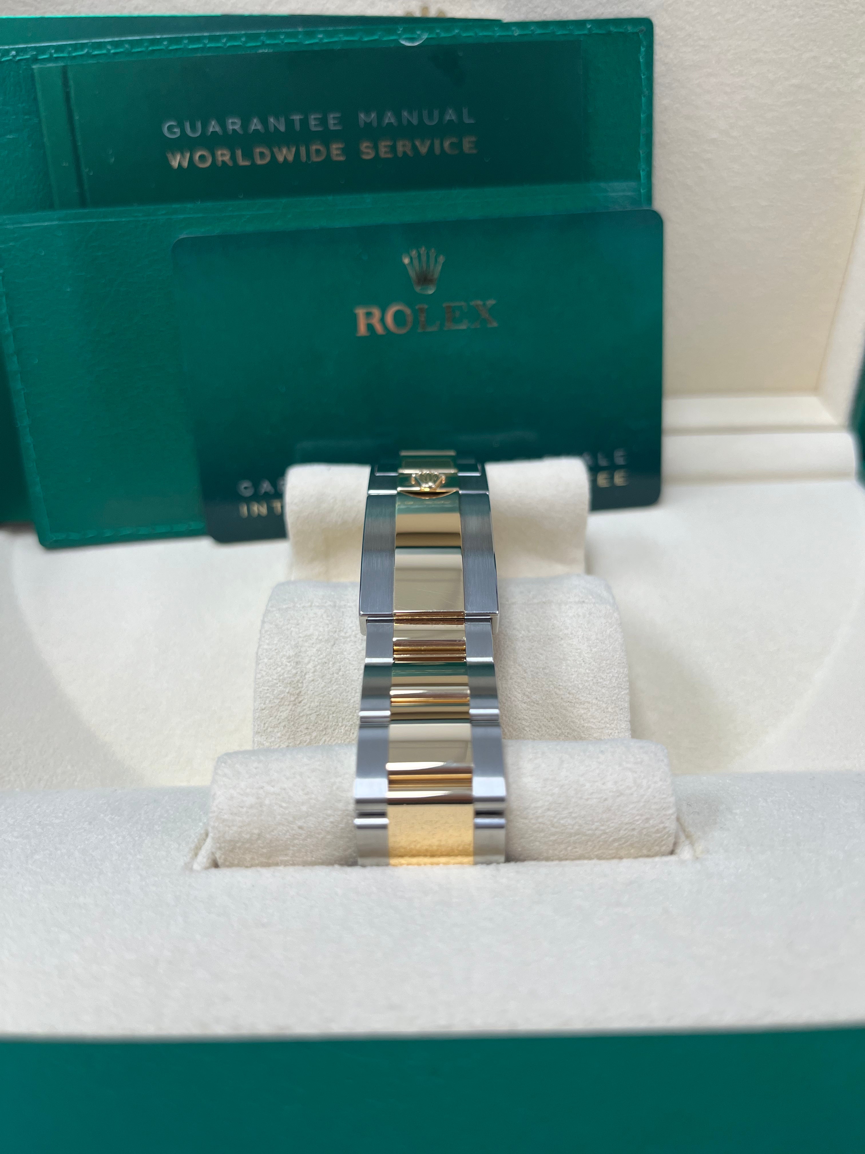 40mm Yellow Rolesor case with 904L steel monobloc middle case, screw-down steel back, screw-down crown and push buttons with Triplock triple waterproofness, fixed 18K yellow gold bezel with engraved tachymetric scale, scratch-resistant sapphire crystal, champagne dial, index hour markers, Rolex calibre 4130 self-winding movement with chronograph central second hand, 30-minute counter at 3 o'clock, and 12-hour counter at 9 o'clock, approximately 72 hours of power reserve, 18K yellow gold Oyster bracelet with flat three-piece links made from a combination of 904L steel and 18K yellow gold, folding Oysterlock buckle with Easylink 5mm comfort extension link. Waterproof to 100 meters.